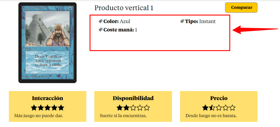 - Lista de características: son los aspectos técnicos que quieres mostrar de cada producto. Pueden tratarse de valores absolutos introducidos manualmente en cada producto (como peso, resolución, tamaño, materiales, …) o indicadores de si el producto cuenta (✓) o no (x) con esta característica (como, por ejemplo: WiFi, reposabrazos, para indicar que incluye algún extra, …).