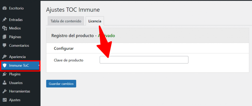 Una vez tengas el número de tu clave de licencia, accede al menú de WordPress de tu web y en Immune ToC > Licencia encontrarás un apartado para introducir tu clave de licencia.