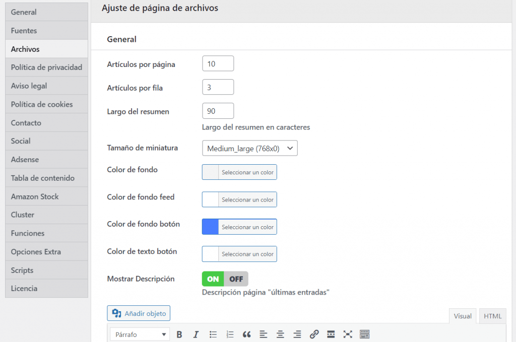 Por último, para las “últimas entradas” (página de archivos que puedes seleccionar para que sea la página de inicio / homepage desde Ajustes > Lectura) puedes activar el botón de mostrar descripción si quieres que aparezca una descripción previa a la parrilla de artículos o entradas. Esta descripción podrás redactarla en el editor que encontrarás a continuación.