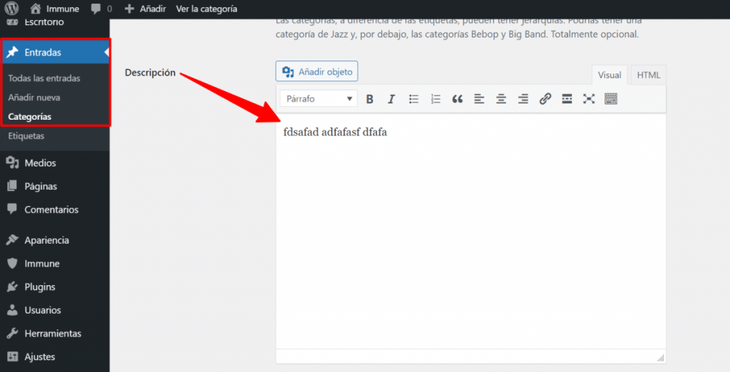 Si quieres mostrar una descripción previa al listado de archivos dentro de una página de categoría, deberás incluir esta descripción en la categoría correspondiente. Para ello ve a Entradas > Categorías y selecciona la categoría que quieras editar. Dentro del apartado Descripción añade el texto que quieres que se muestre en la página de archivos de dicha categoría.