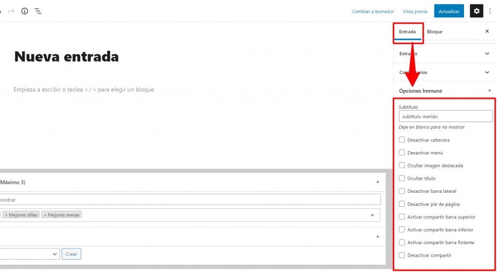 Immune Theme® incluye, dentro del editor de Gutenberg, un menú adicional denominado Opciones Immune dentro de los ajustes de la entrada o página. Estas opciones permiten mostrar u ocultar distintos elementos. Así podrás realizar varias acciones específicas dentro de la página o entrada como: desactivar el menú, la cabecera, la barra lateral o el pie de página, activar o desactivar individualmente las opciones de compartir tus contenidos en redes, ocultar el título o la imagen destacada o añadir un subtítulo al H1.