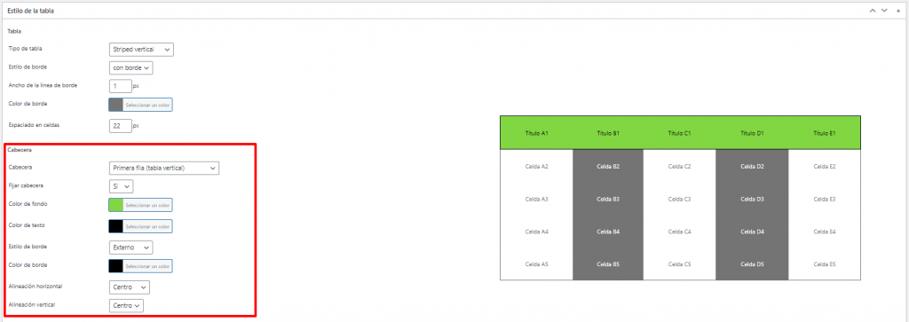 Aquí se definen los ajustes relativos a la cabecera de la tabla, es decir, la primera fila (en una tabla vertical) o primera columna (en una tabla horizontal):