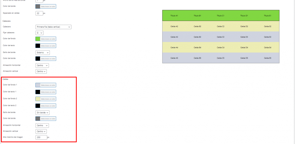 Aquí se definen los ajustes relativos a las celdas de la tabla: