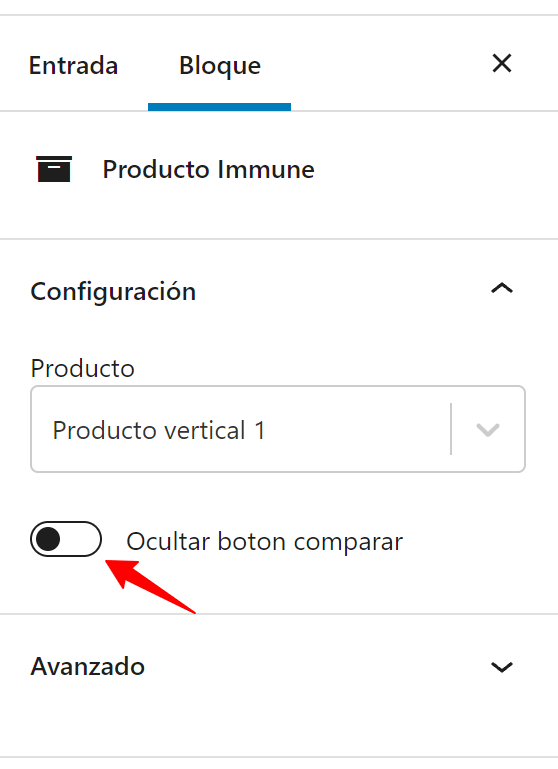 Si quieres usar una caja de producto pero no quieres que tenga el botón de comparar (por ejemplo, en un artículo review de un solo producto) puedes definir que el botón de comparar no se muestre. Para ello deberás marcar la opción Ocultar botón comparar dentro de los ajustes del bloque del producto.