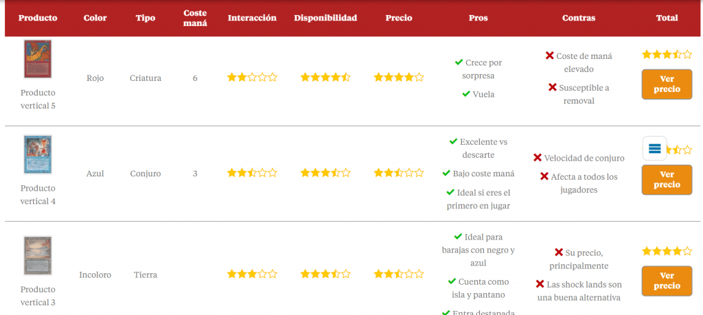 La comparativa Immune es una tabla comparativa que se genera automáticamente a raíz de las categorías de producto. Esta tabla comparativa recoge toda la información agregada dentro de la categoría y cada uno de sus productos. Esta tabla muestra de cada producto: su imagen, las características, los atributos, sus pros y contras, qué valoración total tiene y un botón con su enlace de afiliado.