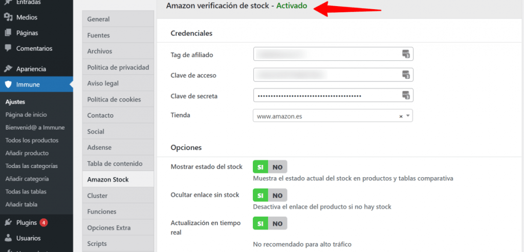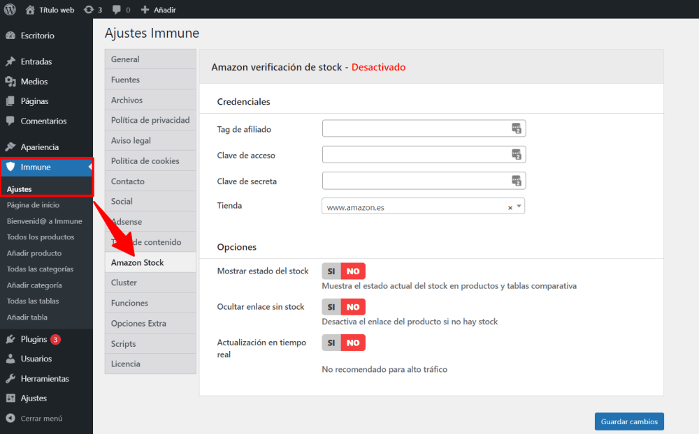 No olvides clicar en el botón de Guardar cambios y, si todos los datos se han introducido correctamente, verás que la opción pasa a estar activada. ¡Enhorabuena, ya has configurado Amazon Stock! Ahora vamos a ver cómo incluirlo dentro de tus productos Immune.